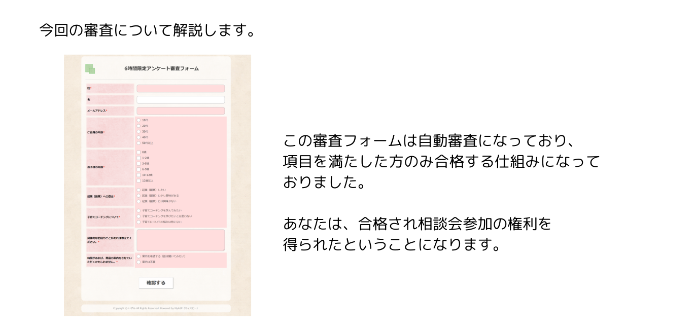 おめでとうございます! 自動審査に合格されましたので、無料説明会へのご予約が確定しました。
