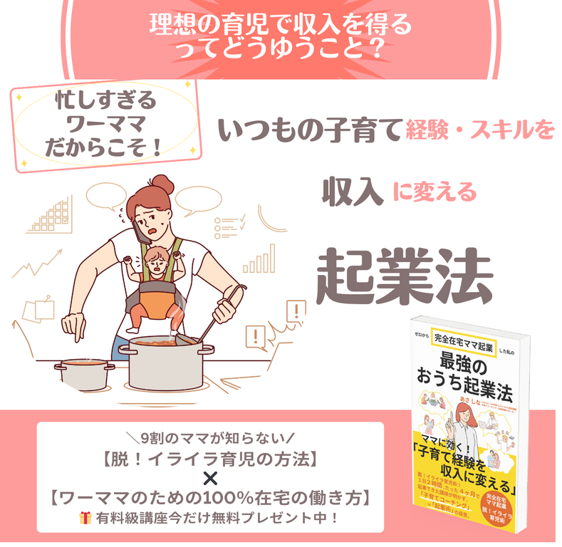 これだけでも十分価値があるのに、この子育て経験とコーチングの知識とスキルを活かしておうちで起業すると、びっくりするぐらい時間・お金・心の余裕が生まれました。